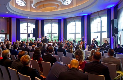 For the orchestral concert, Offstage used L-R arrays of an Alcons QR24 modular line-source array column and QM24 LMF array extension, plus VR8 compact versatile monitors as frontfills. The system was powered by a Sentinel3 amplified loudspeaker controller. For the party, which took place in a different part of the ballroom, two VR8s and a Sentinel10 were used.
