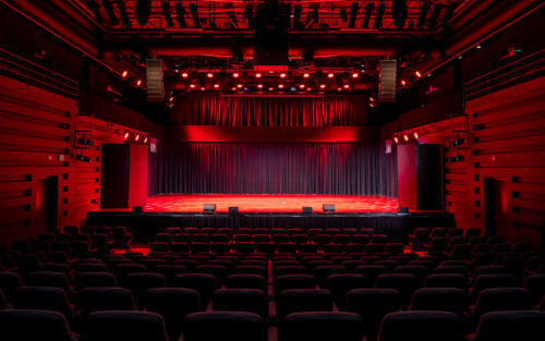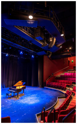 A multi-purpose room with a thrust stage and audience of 378 in a semi-circular amphitheatre configuration. This allows fabulous sight lines, but a challenge to amplify and distribute sound equally.
